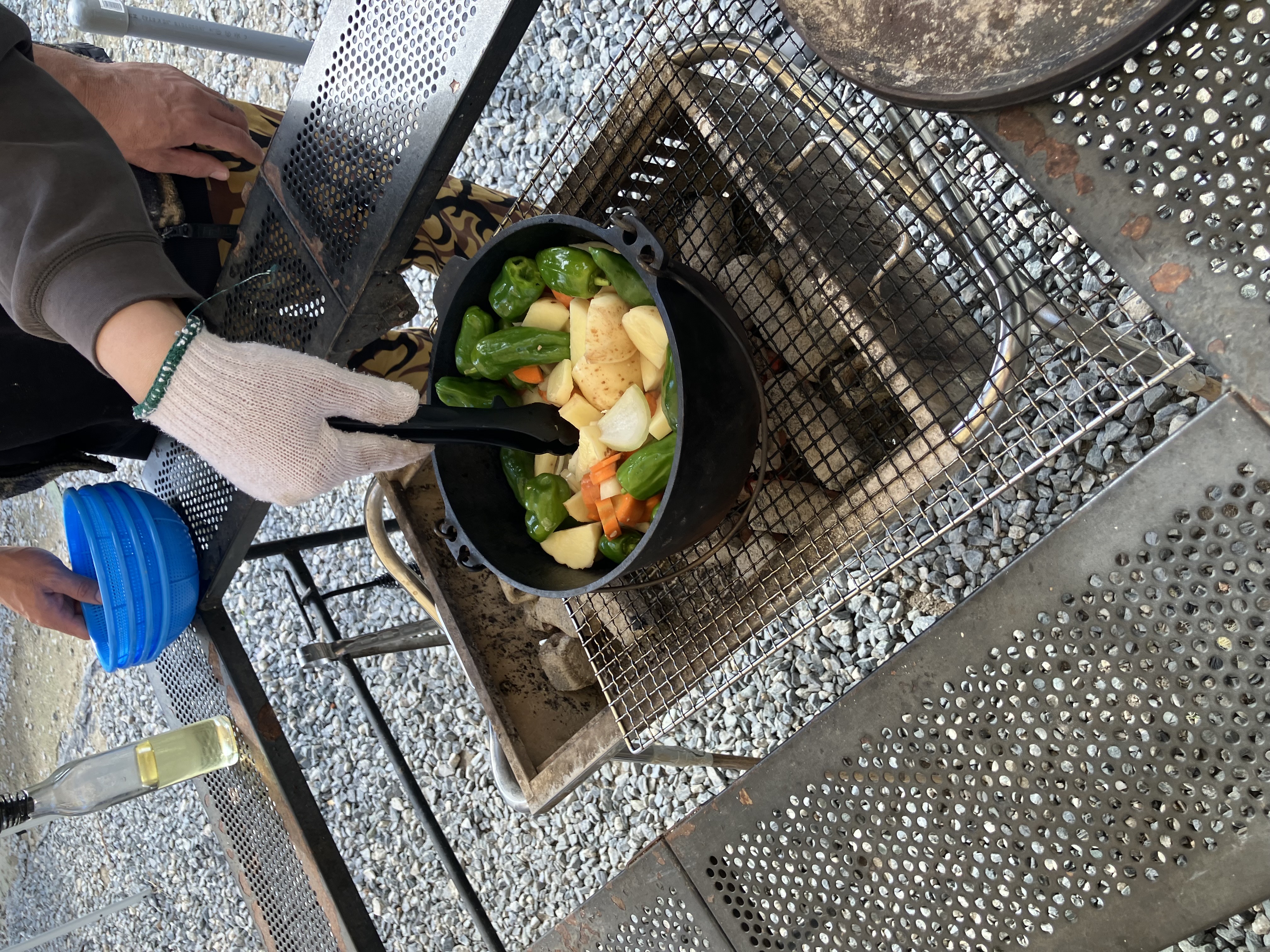 いや、こう見えてもトングでまぜているので袖口がマジで熱いんですよ!炭火なめんなって感じです。完全に私だけ8月ですよ。